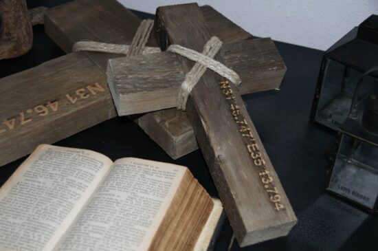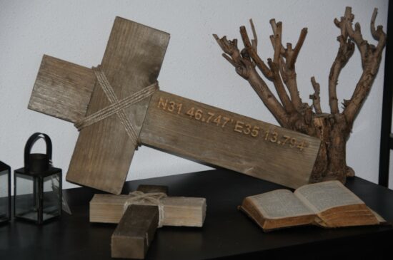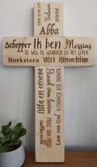 Houten Kruis “Want God had de wereld zo lief..” M Blank