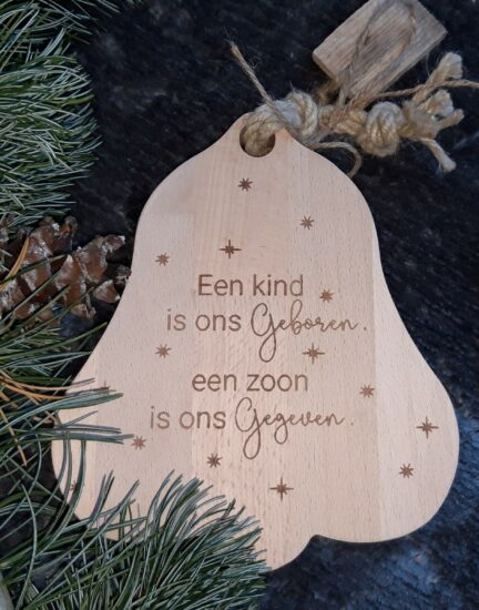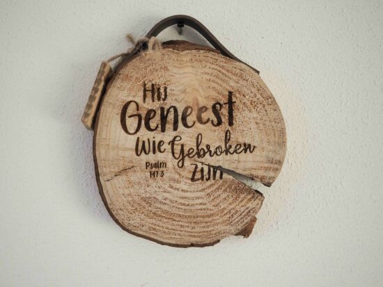 Boomschijf met leren band “Hij geneest..”