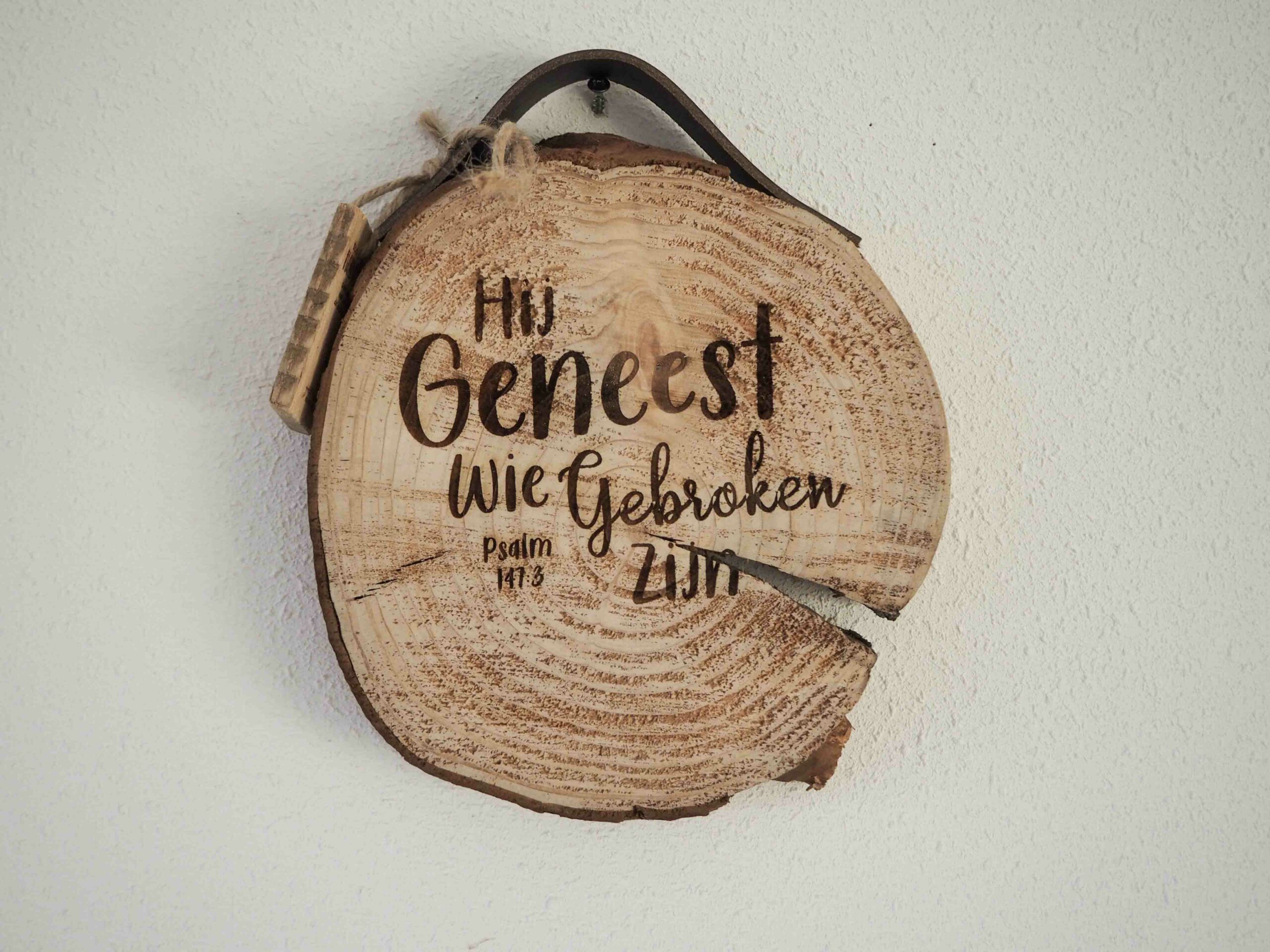 Boomschijf met natuurlijke scheur, voorzien van leren band en de tekst “Hij geneest wie gebroken zijn” naar Psalm 147:3.