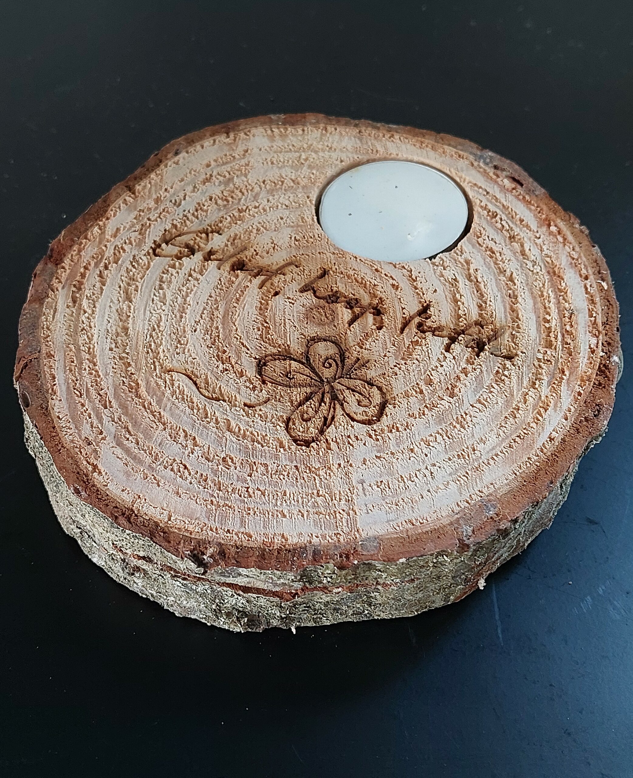 Rustieke boomschijf voorzien van een waxinelichtje en tekst. Elk exemplaar is uniek. Qua vorm en maat kan de boomschijf afwijken van de foto. Mede mogelijk gemaakt door mensen met een afstand tot de arbeidsmarkt.