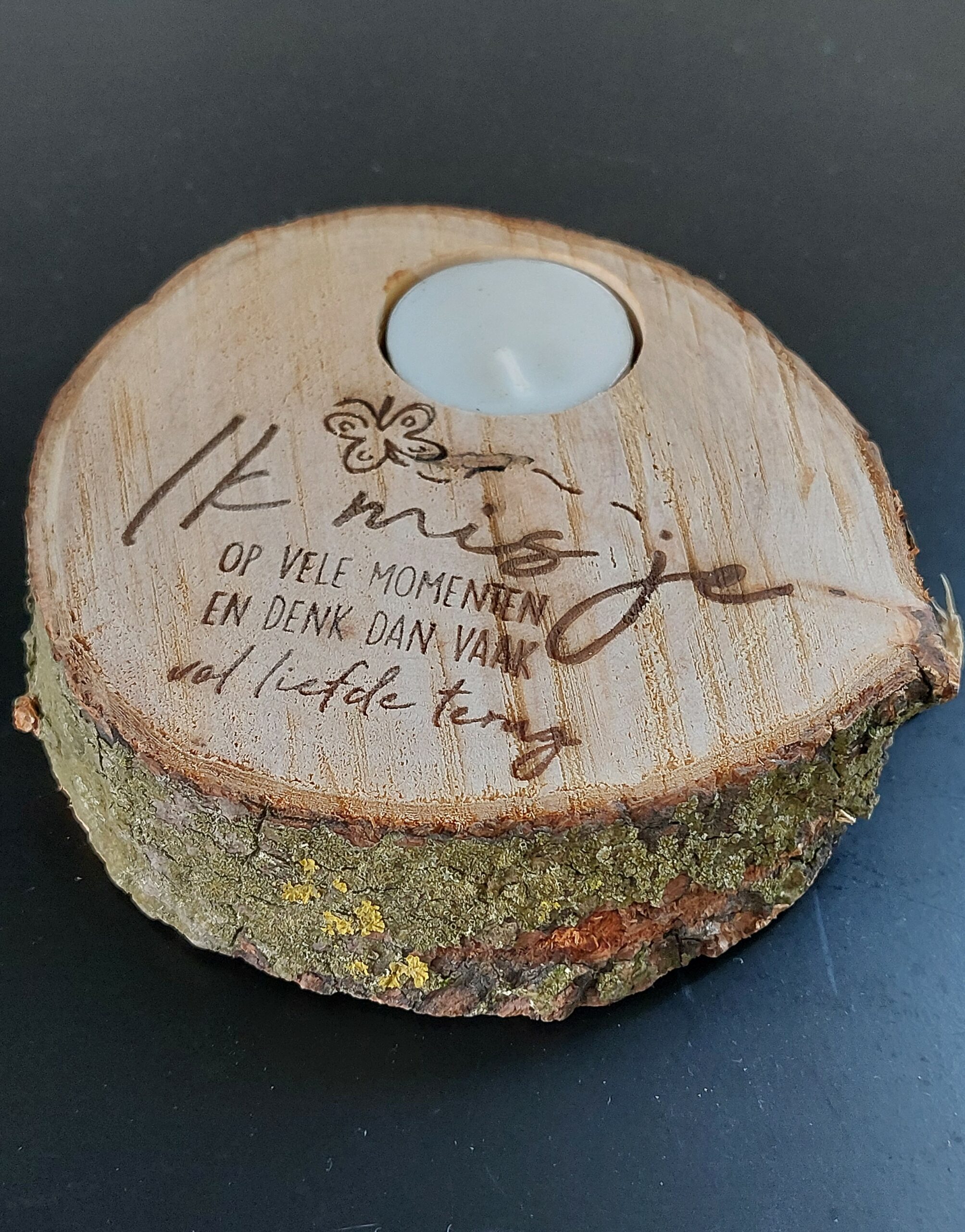 Home » Winkel » Boomschijf met waxinelichtje – Ik mis je..
