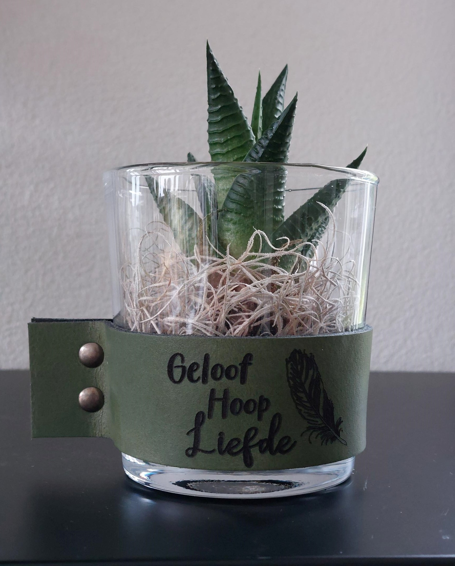 Cilinder Vaas met leerelement met tekst Geloof, Hoop, LIefde. Mede gemaakt door mensen met een achterstand op de arbeidsmarkt. Deze vaas wordt geleverd exclusief inhoud.