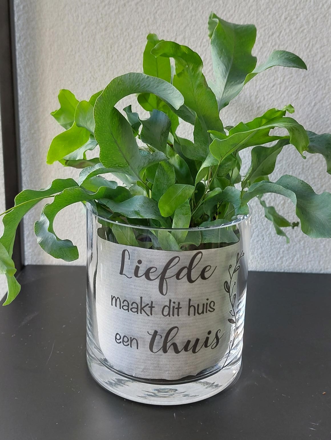 Cilinder Vaas S met tekst Liefde maakt dit huis een thuis. Mede gemaakt door mensen met een achterstand op de arbeidsmarkt. Deze vaas wordt geleverd exclusief inhoud.