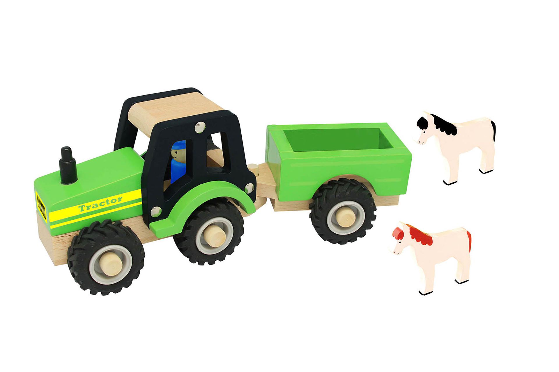 Stevige houten tractor met aanhangwagen en 2 paarden, op stoere rubberen wielen.