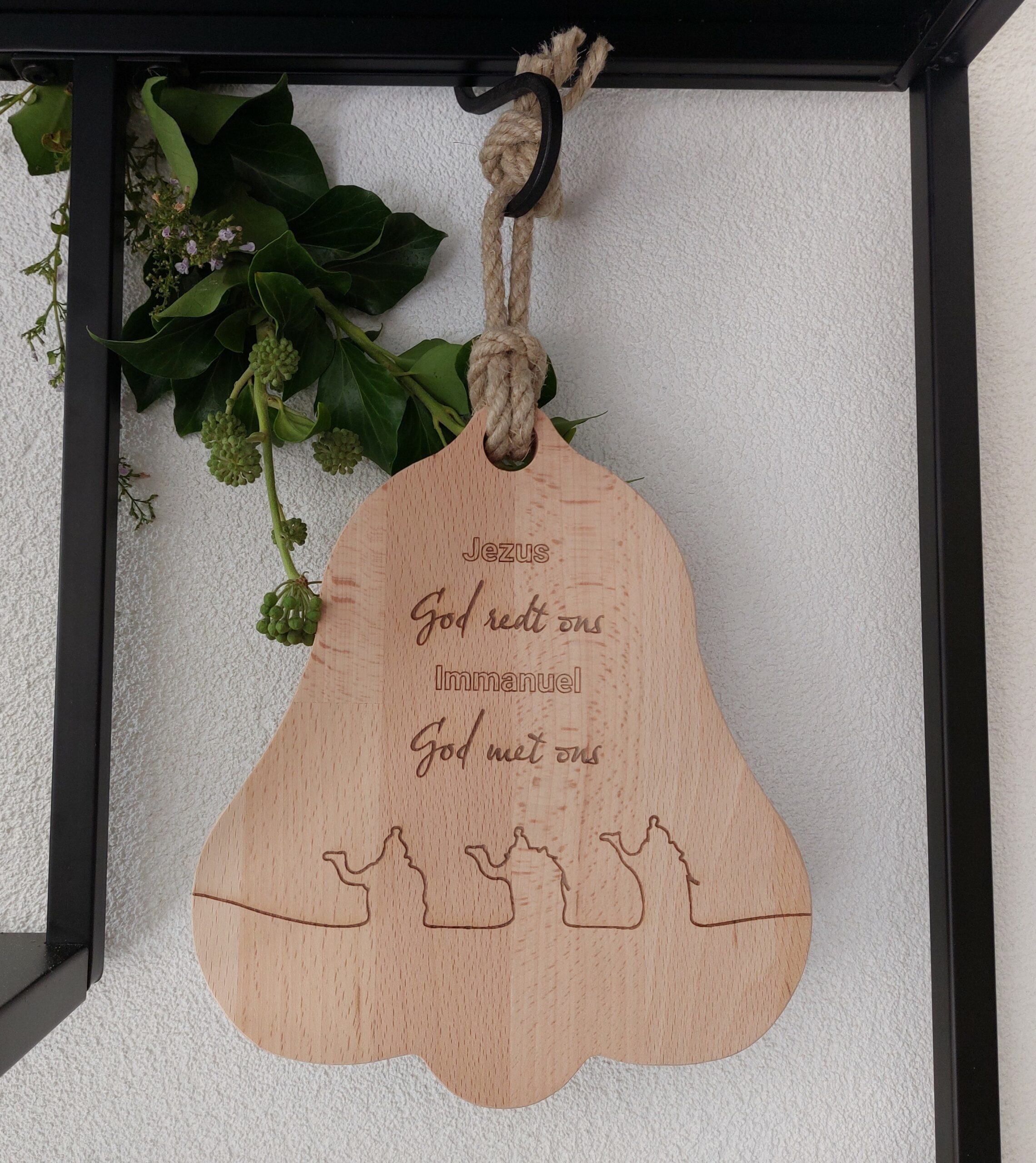 Houten kerkklok met de drie wijzen. Handgemaakt door mensen die begeleid worden in onze samenleving. Incl. robuust touw. Gemaakt met een Hart.