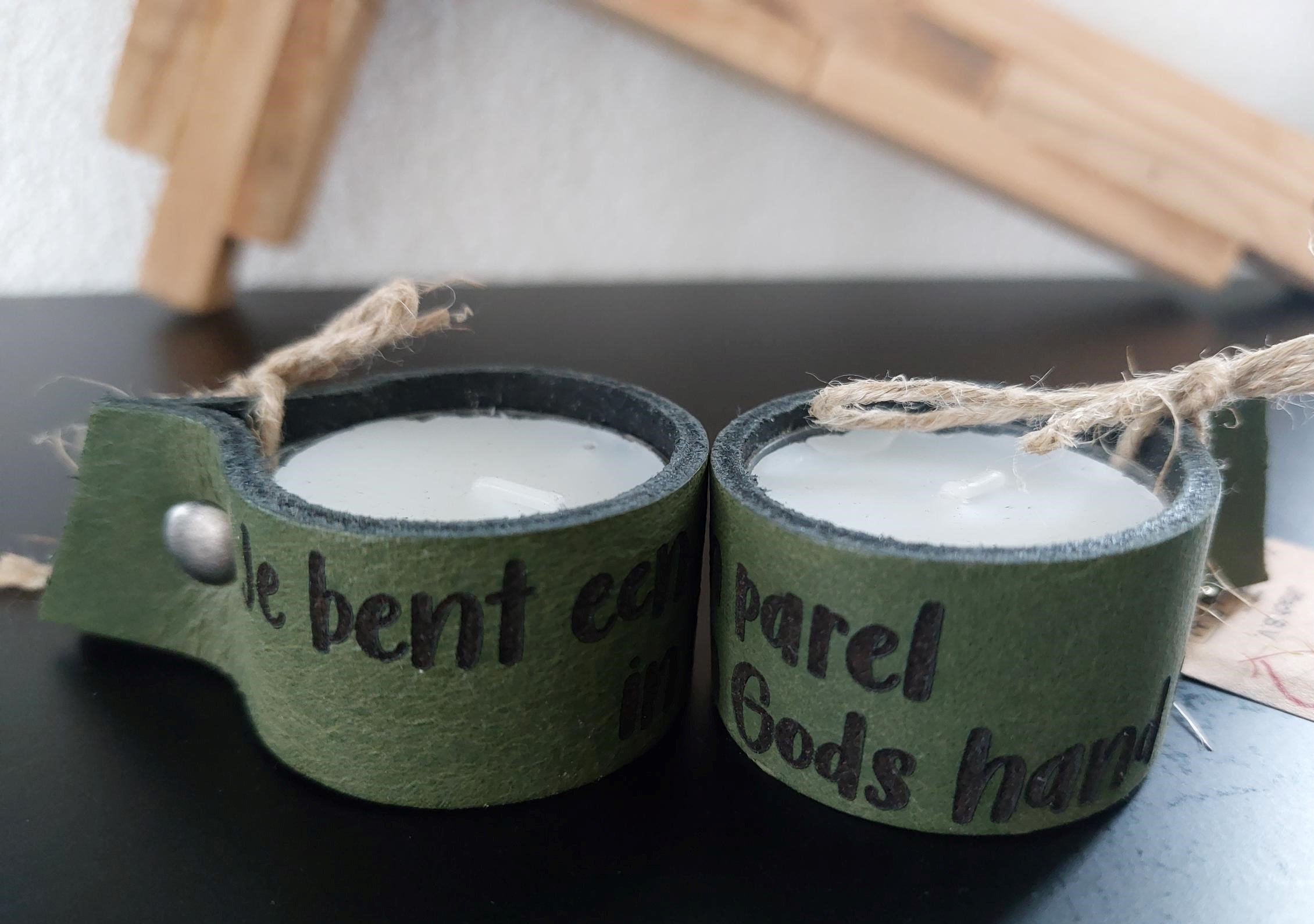 Home » Winkel » Leren waxinelichtjeshouder Groen Je bent een parel in Gods hand (set van 4)