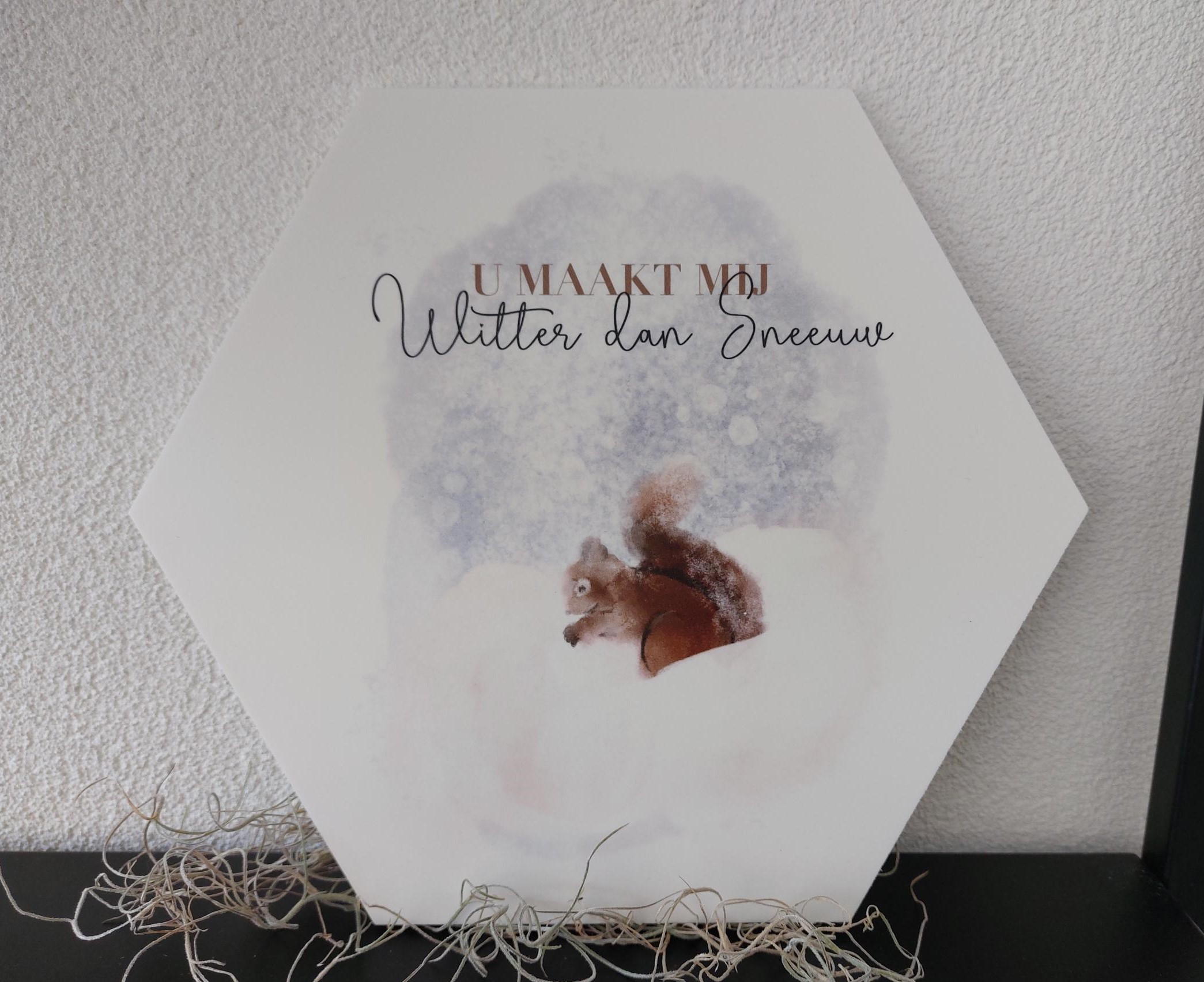 Geprinte muurdecoratie in trendy kleuren met sprekende tekst of symbool.