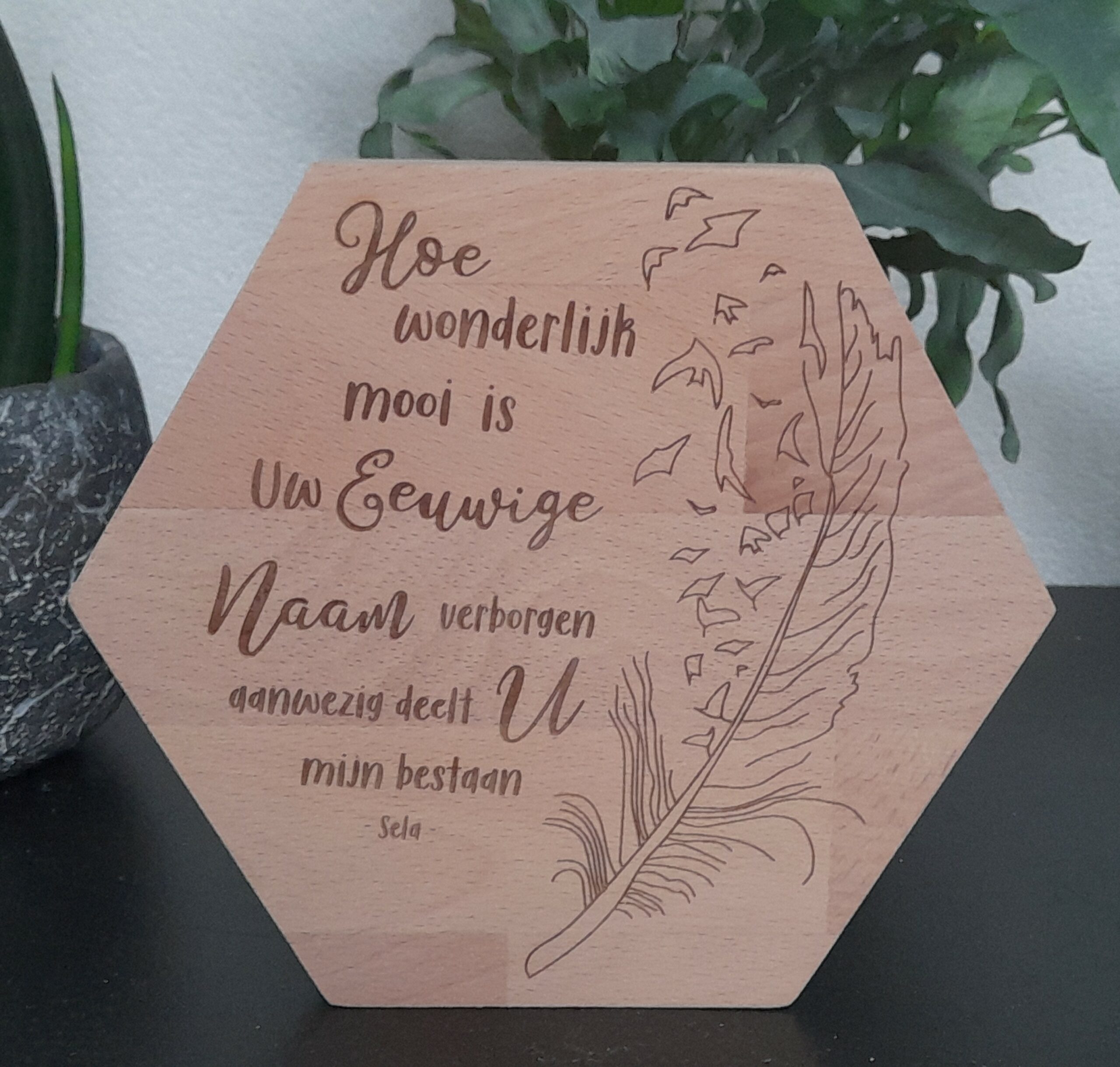 Houten Nordic Honingraat om neer te zetten, voorzien van een prachtige tekst en artwork. Handgemaakt door mensen die begeleid worden in onze samenleving. Gemaakt met een Hart.