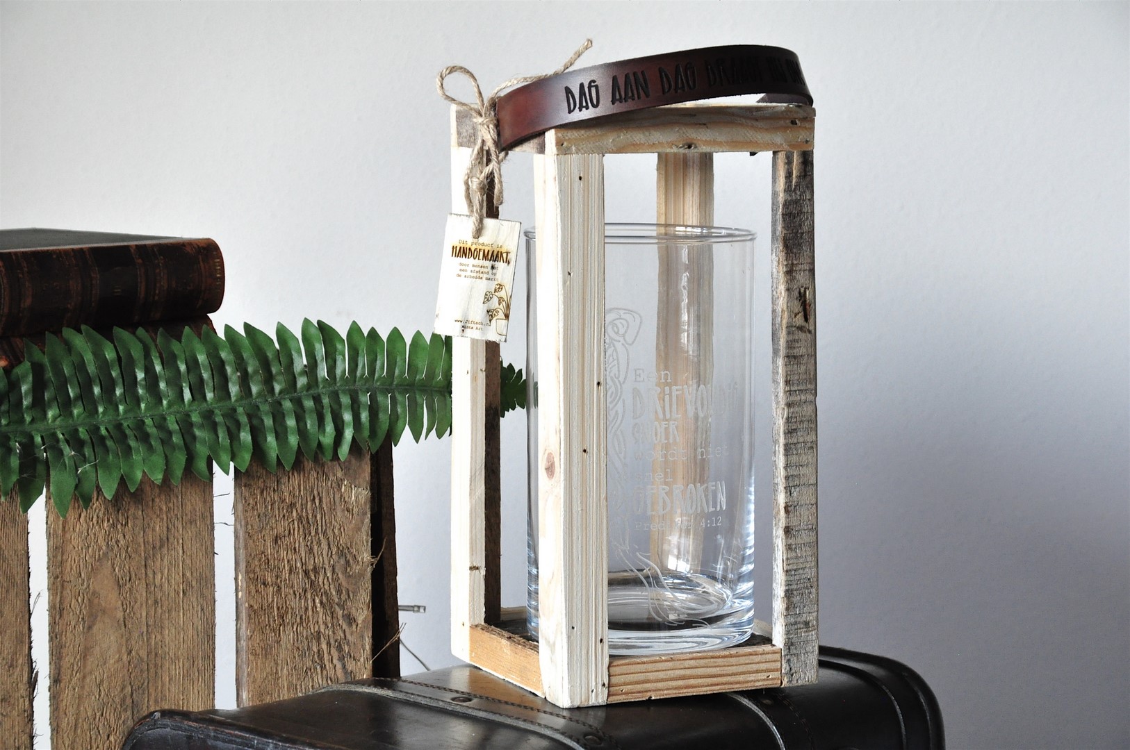 Rustieke Lantaarn handgemaakt incl. vaas met Drievoudig snoer. Tekst: Een Drievoudig snoer wordt niet snel gebroken. Prediker 4:12. Dit product is mede tot stand gekomen door mensen met een afstand tot de arbeidsmarkt.