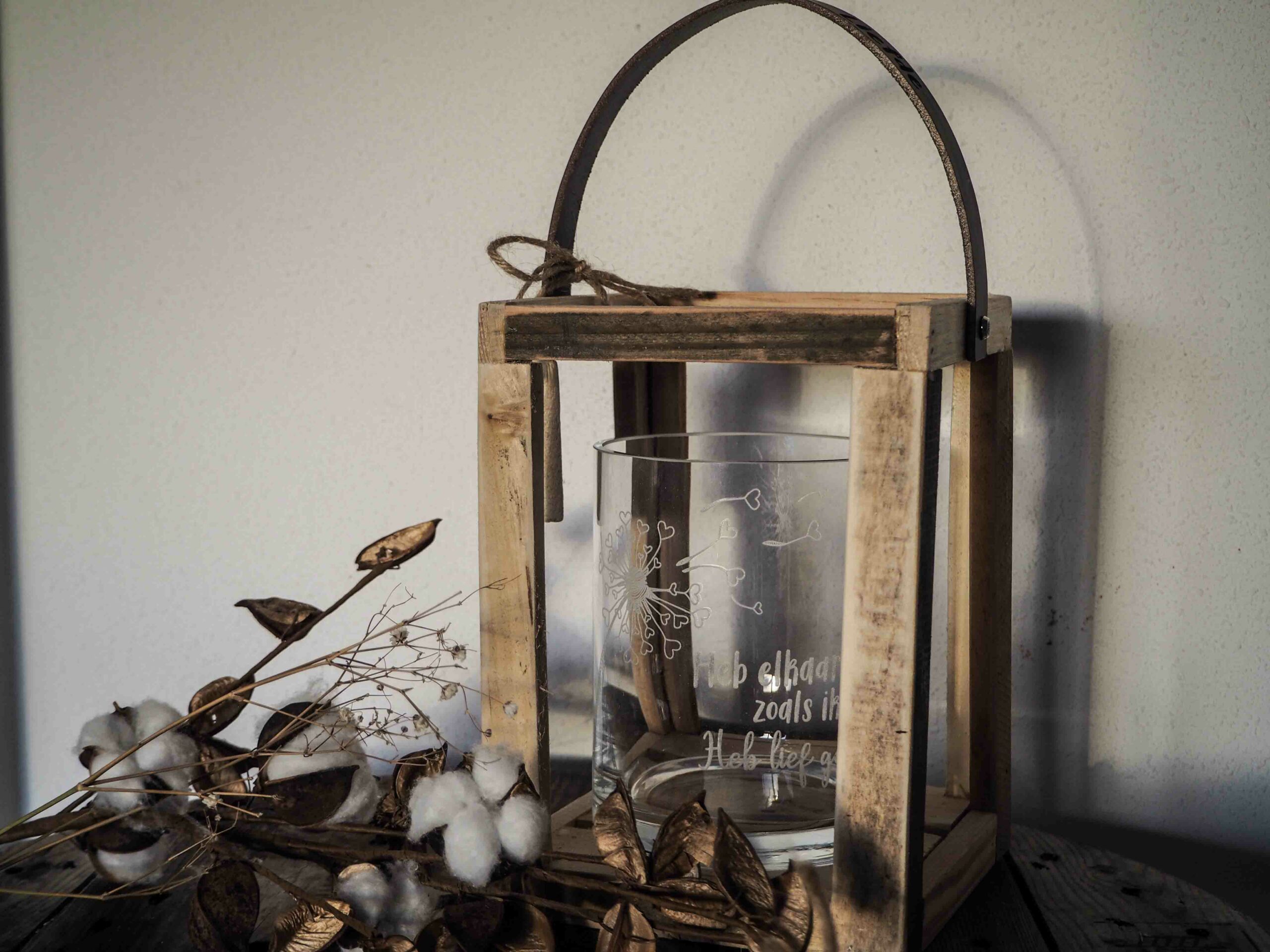 Rustieke lantaarn met leren band, met tekst “Geloof, hoop en liefde”. In de lantaarn een glazen cilinder vaas met de tekst “Heb elkaar lief”. Gemaakt door mensen met een afstand tot de arbeidsmarkt.