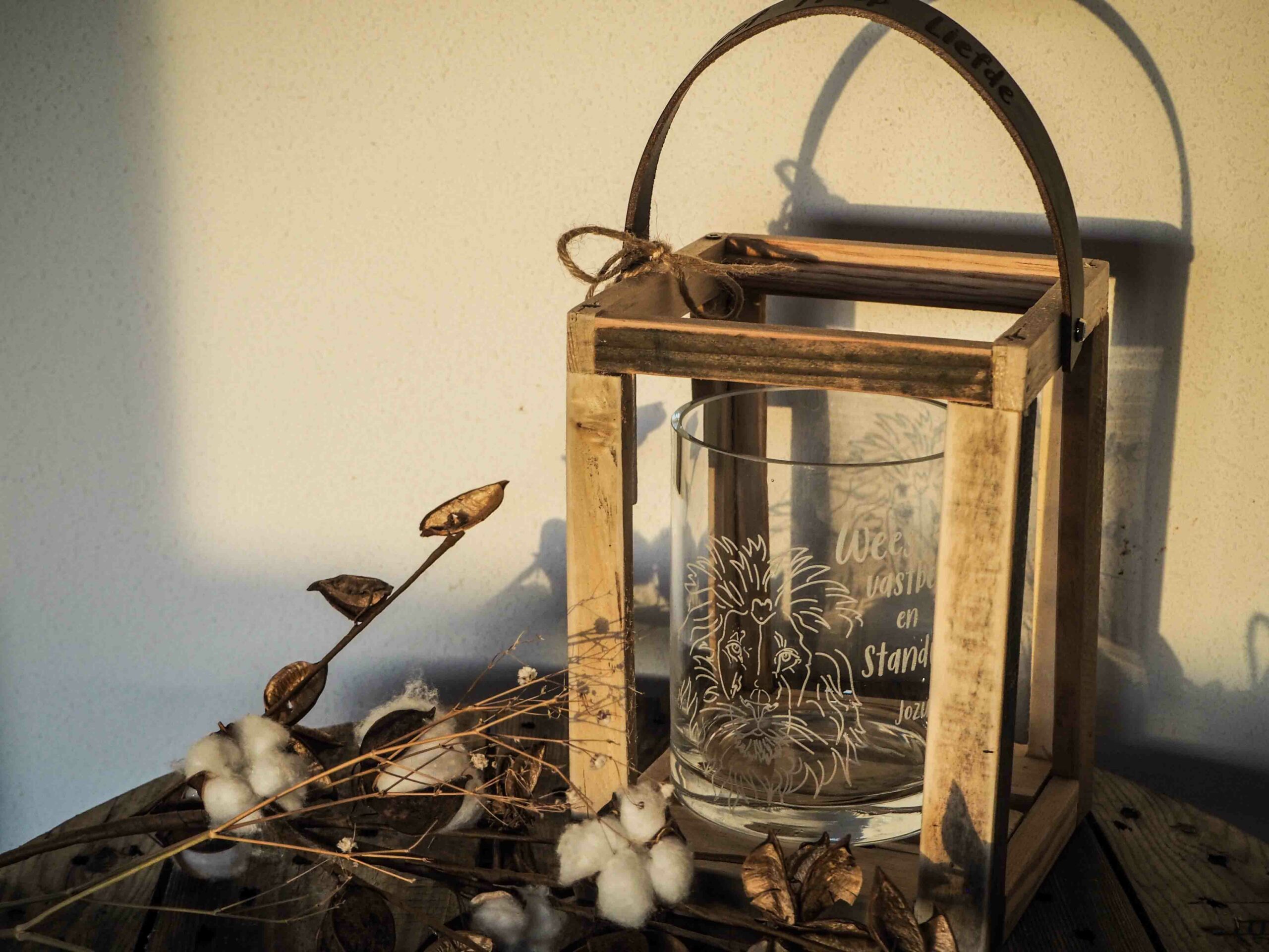Rustieke Lantaarn handgemaakt incl. vaas met Leeuw. Tekst: Wees Vastberaden en Standvastig. Jozua 1:9. Dit product is mede tot stand gekomen door mensen met een afstand tot de arbeidsmarkt.