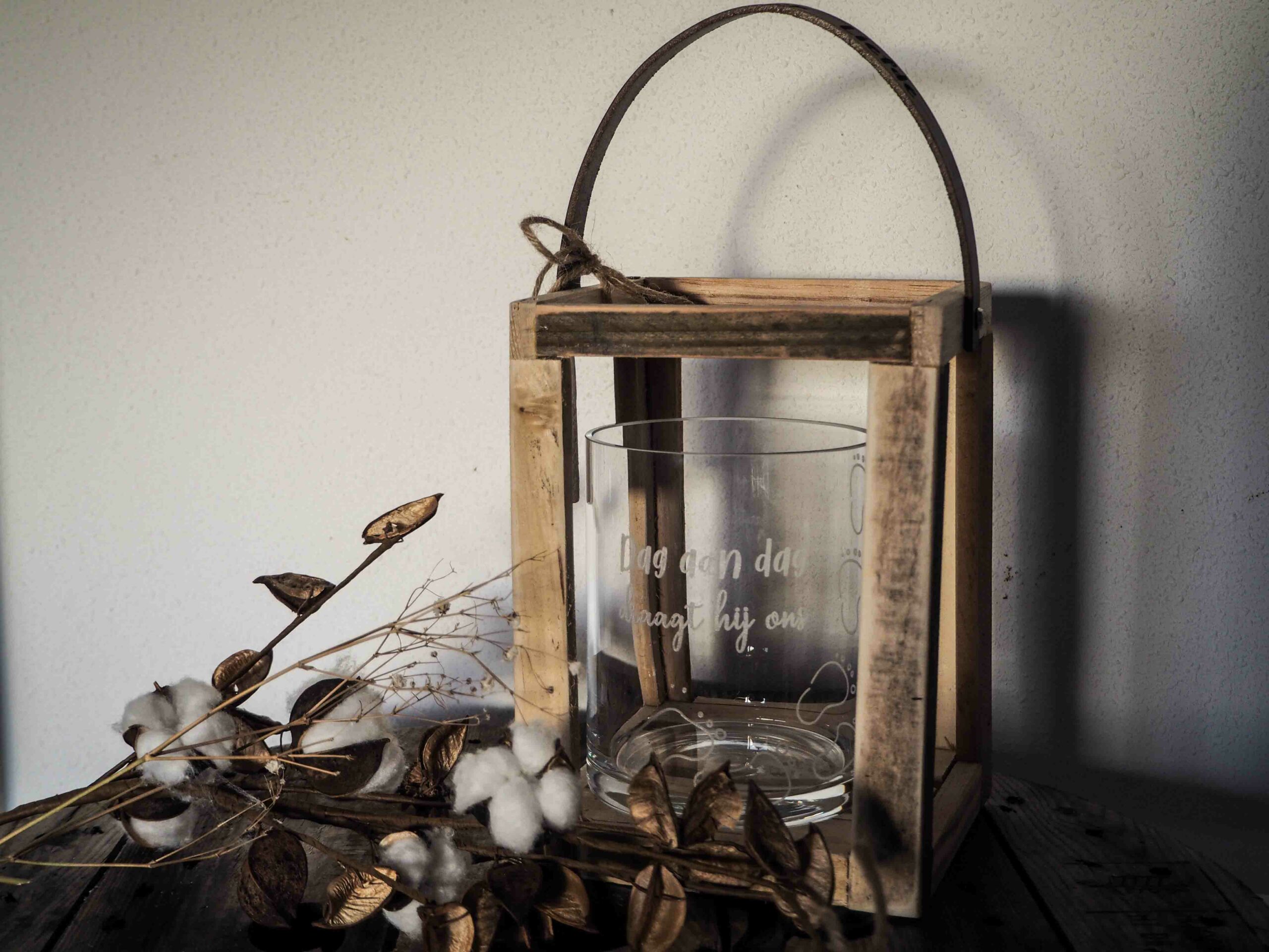 Rustieke Lantaarn handgemaakt incl. vaas met Voetsstappend. Tekst: Dag aan Dag draagt Hij ons. Dit product is mede tot stand gekomen door mensen met een afstand tot de arbeidsmarkt.