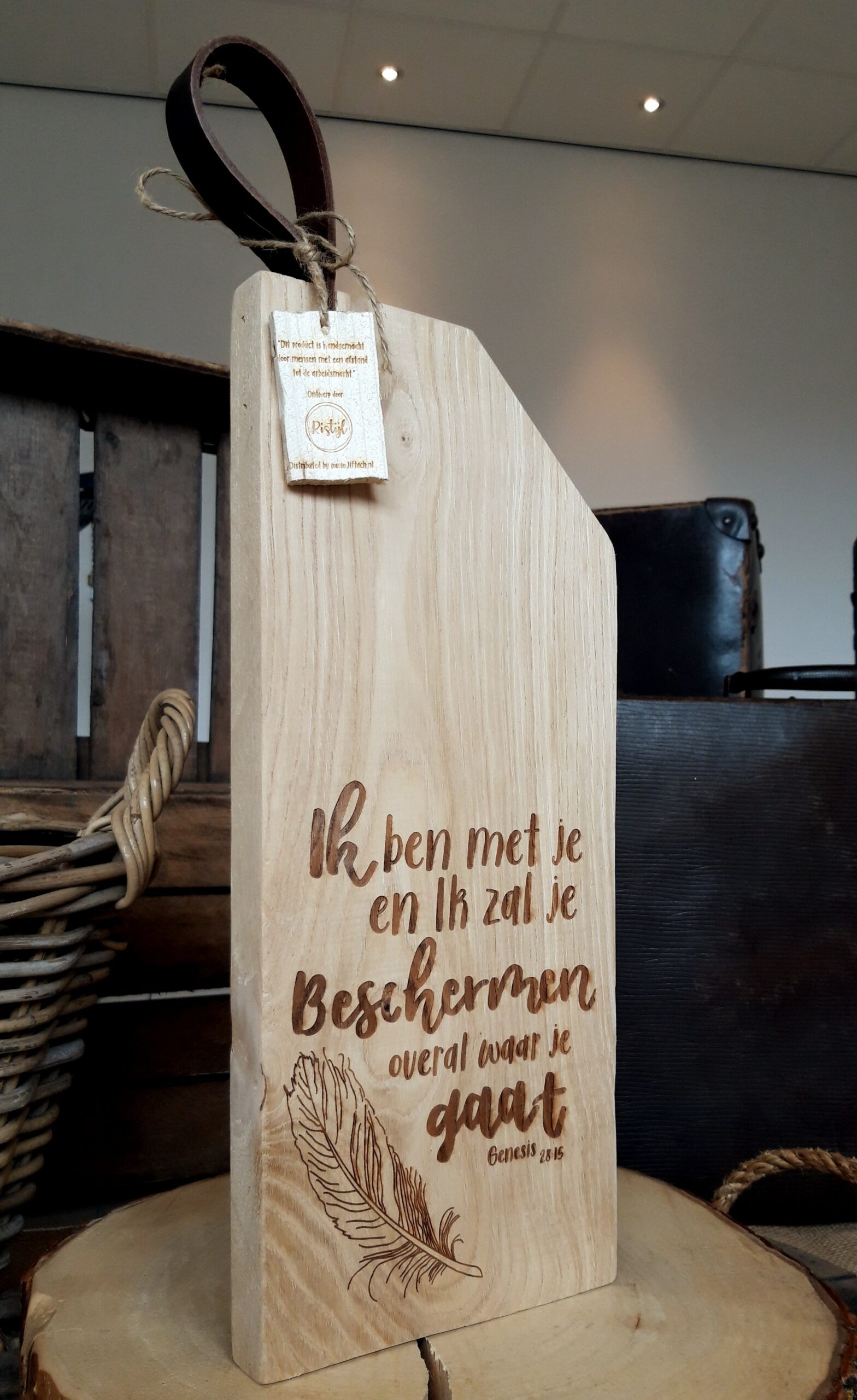 Home » Winkel » Snijplank met leren lus “Ik ben met je en ik zal ..”