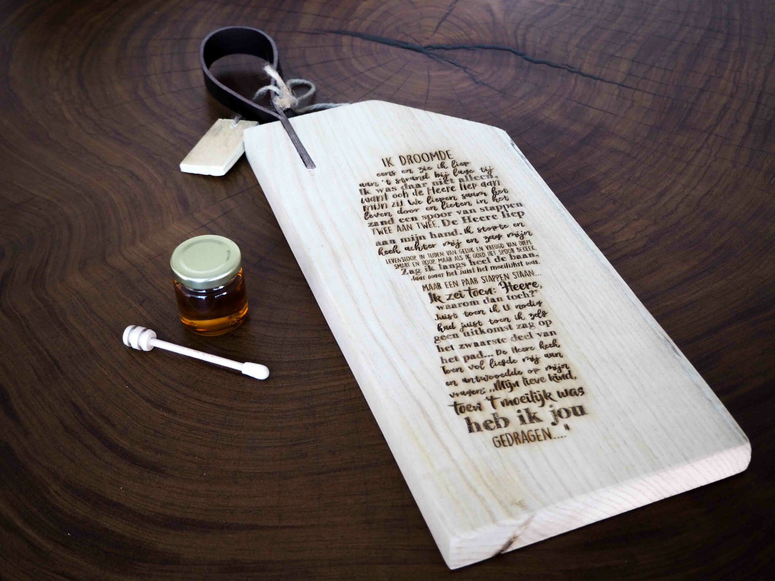 Mooie stevige snijplank met leren lus/handvat, met de tekst van het gedicht “Ik droomde eens en zie..” in de vorm van een voetstap erop. Gemaakt door mensen met een afstand tot de arbeidsmarkt.