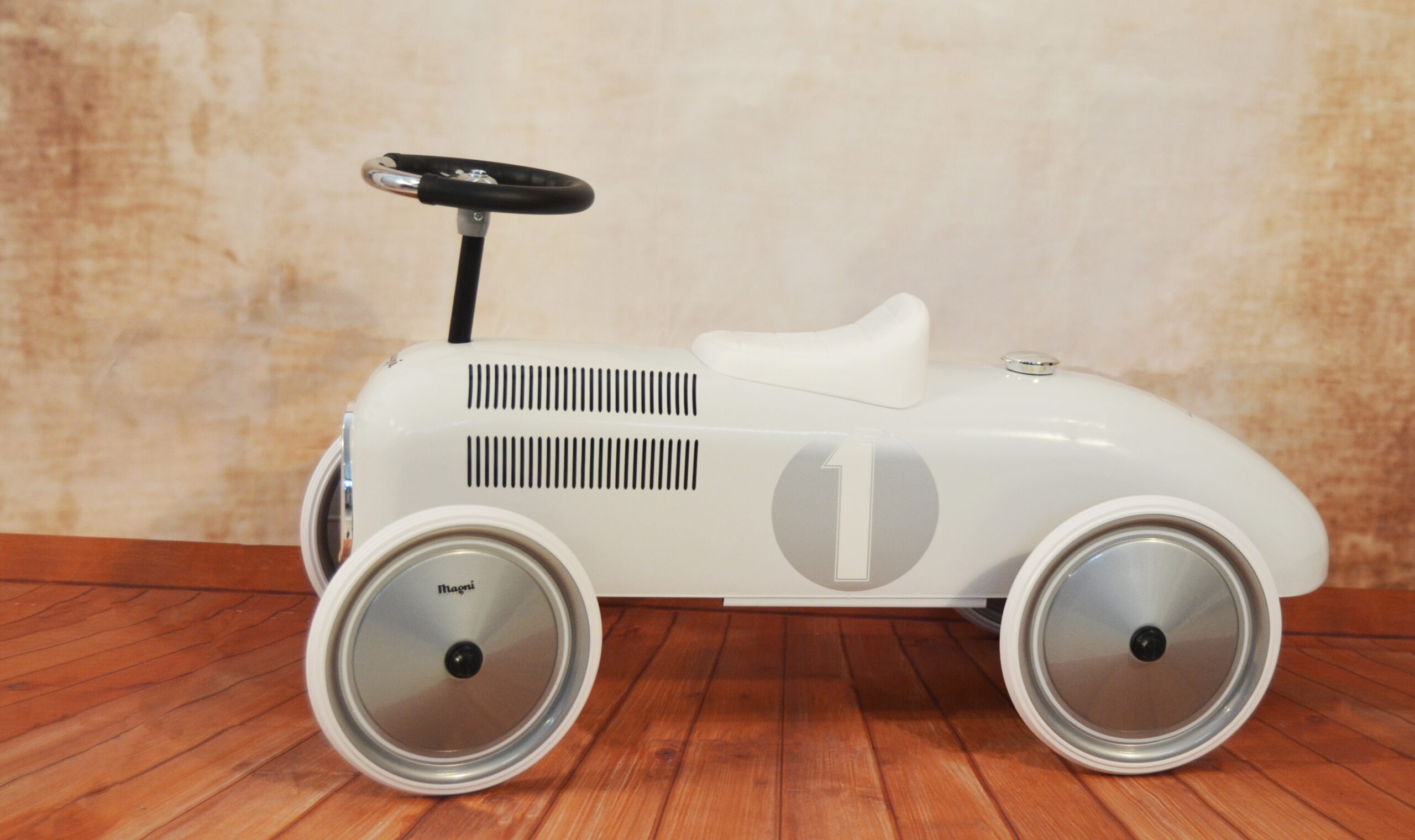 Met deze snelle bolide moet je wel meters maken! Metalen loopauto in snelle witte uitvoering.