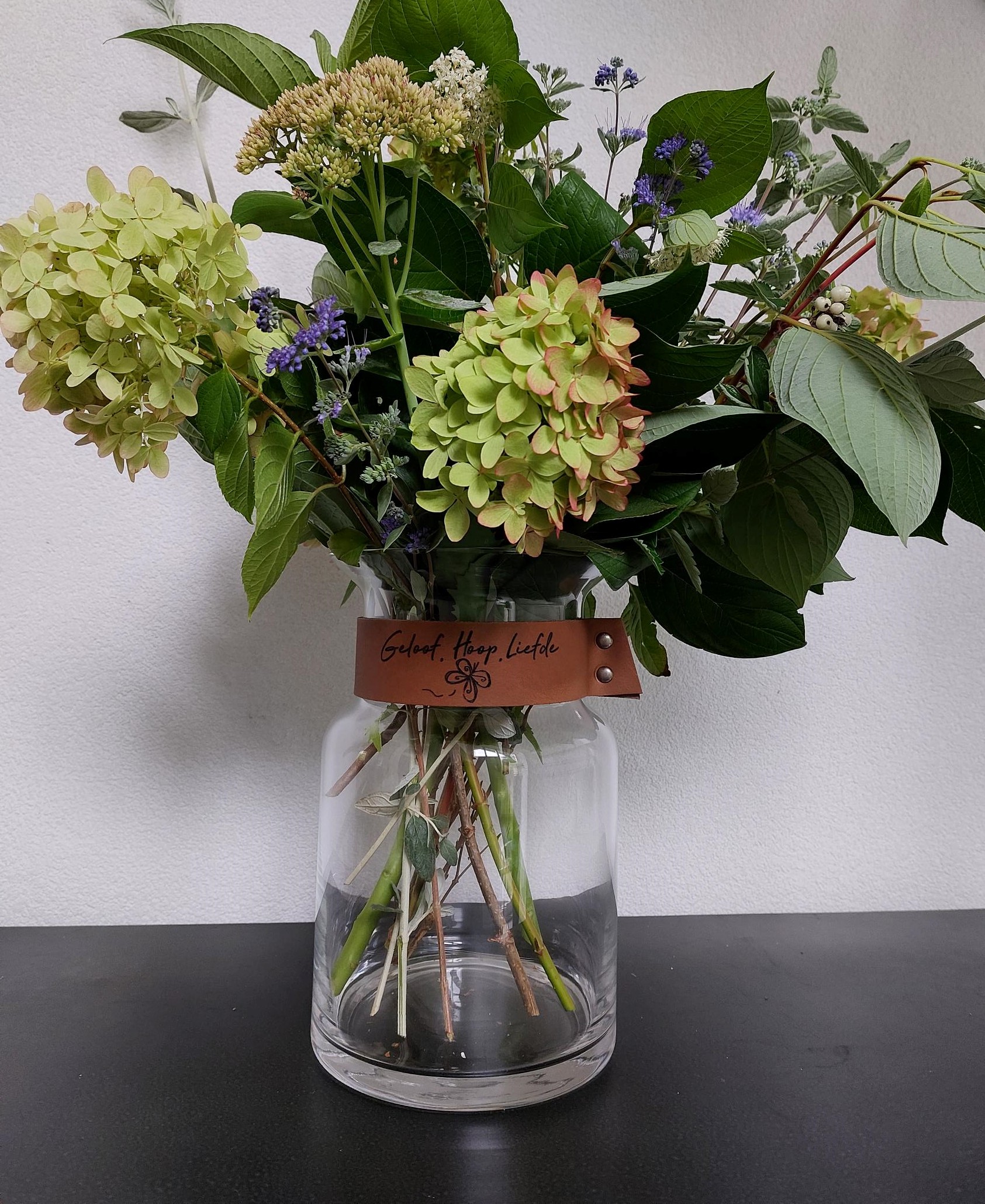 Prachtige bloemenvaas met leerband. Mede gemaakt door mensen met een achterstand op de arbeidsmarkt. Deze vaas wordt geleverd exclusief inhoud.