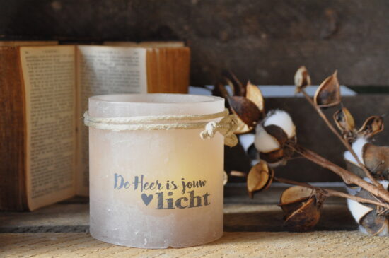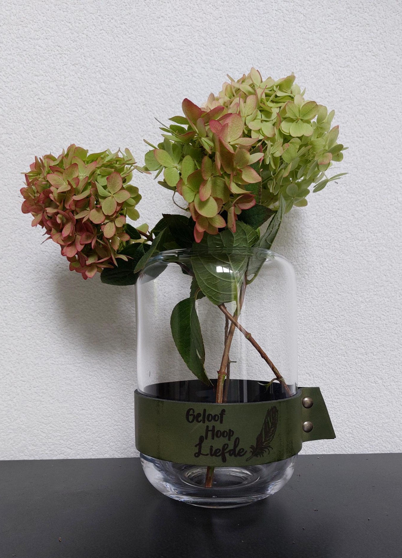 Prachtige bloemenvaas met leerband. Mede gemaakt door mensen met een achterstand op de arbeidsmarkt. Deze vaas wordt geleverd exclusief inhoud.