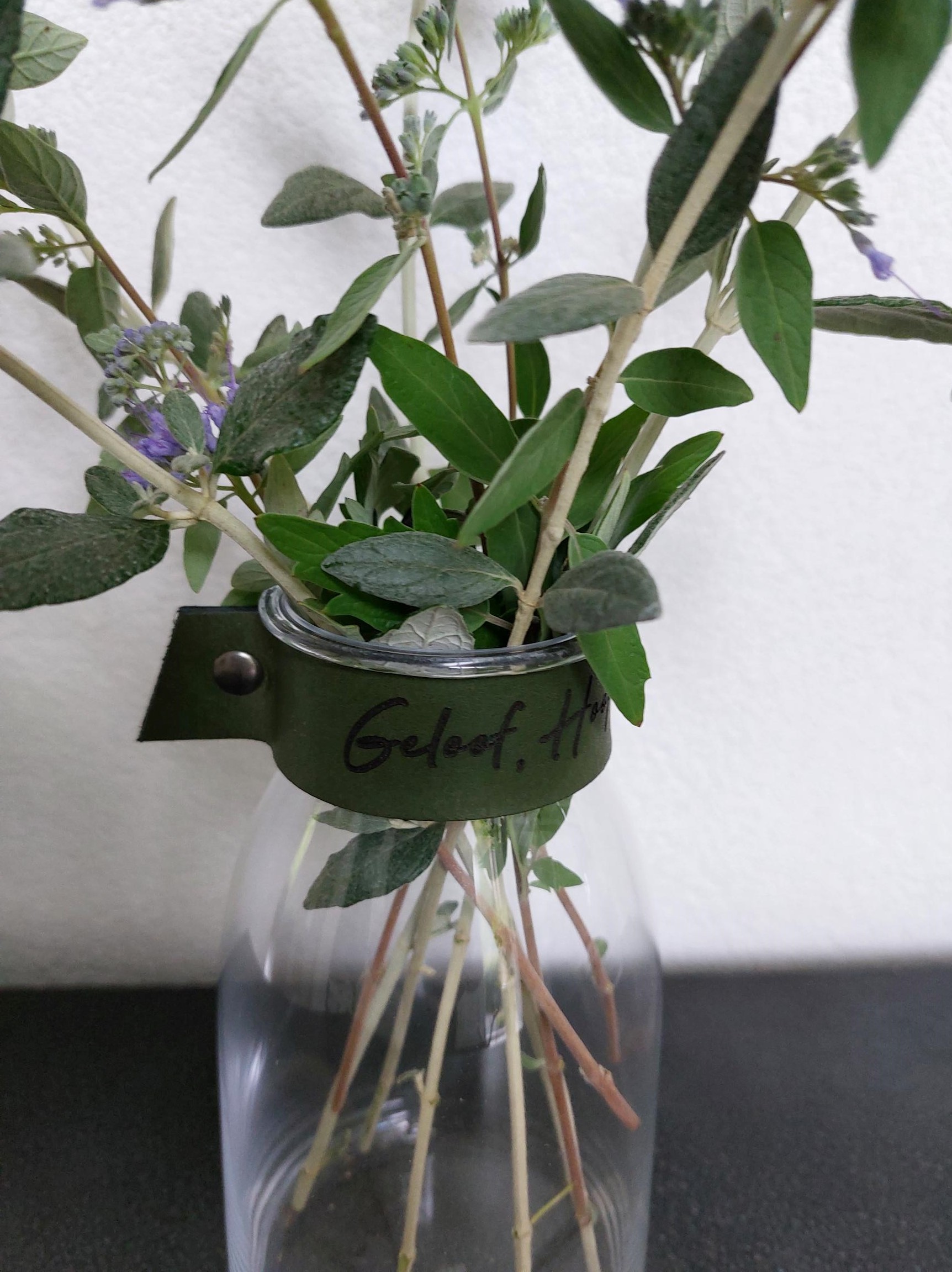 Prachtige bloemenvaas met leerband. Mede gemaakt door mensen met een achterstand op de arbeidsmarkt. Deze vaas wordt geleverd exclusief inhoud.